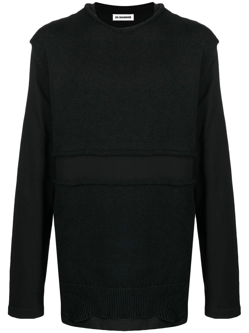 layered knit sweatshirt layered knit sweatshirt from JIL SANDER featuring black, cotton, layered design, knitted upper, rolled trim, crew neck, long sleeves and straight hem. Made in Italy Composition Cotton 9% SIZE & FIT Model measurements Height 6 ft 2 in(1.87 m) Bust/Chest 34.25 in(87 cm) Hips 36.22 in(92 cm) Waist 29.52 in(75 cm) FittingInformation This piece fits true to size. We recommend you get your regular size Cut for a loose fit Made with a mid-weight fabric Washing instructions Hand Wash