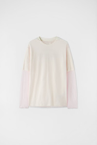Short-sleeved cotton t-shirt with print on back paired with sheer long-sleeved boat-neck t-shirt Details - relaxed fit - double layer - Jil Sander magic orchestra logo printed on back - extremely delicate sheer polyester t-shirt - crew-neck t-shirt 100% cotton, sheer t-shirt 100% polyester - made in Italy - StyleID: J22FV0111JTN325668 Care - dry clean only - iron with care Details - model is 187cm/6'1" and is wearing a size M - Please note that the physical label of the item will show the international size