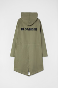 Half-lined cotton poplin hooded parka with printed Jil Sander logo Details - mid-length and oversized fit - snap button closure and drawstring waist and hem - two flap pockets with reinforcement stitching detail - rounded hem with shorter front - printed Jil Sander logo on the back - cotton poplin - 100% cotton - made in Italy - StyleID: J23AA0008J45070317 Care - dry clean only - iron with care Details - model is 187cm/6'1" and is wearing a size 46 IT