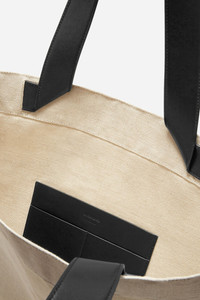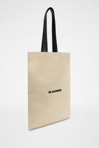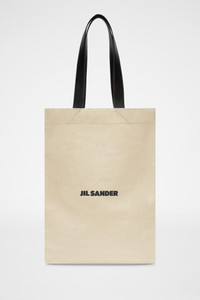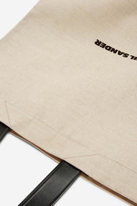 Large-sized canvas shopper bag with leather handles and printed Jil Sander logo on the front Details - inner leather pocket - double leather handles - fits A3 size - cotton and linen canvas - printed Jil sander logo - 70% cotton 30% linen, contrast calf leather - w 40 cm x h 57 cm x d 0,5 cm - made in Italy - StyleID: 8057763778495