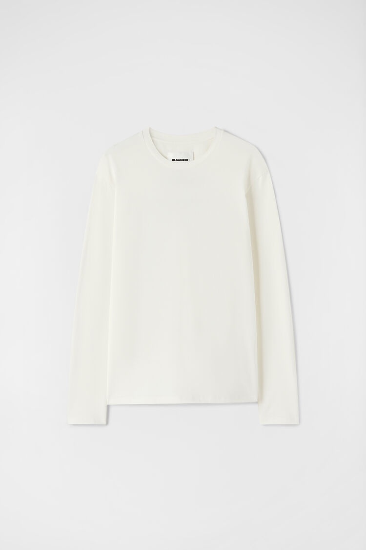 Long-sleeved cotton t-shirt with Jil Sander seasonal logo print on back Details - oversized and long fit - dropped shoulders - crew neck - Jil Sander seasonal logo print on back - 100% cotton - made in Italy - StyleID: J21GC0160J46219104 Care - dry clean only - iron with care Details - model is 187cm/6'1" and is wearing a size M - Please note that the physical label of the item will show the international size