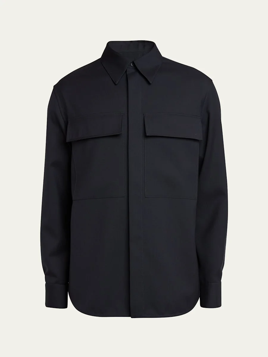 Jil Sander work shirt in solid wool twill Point collar Concealed button placket Two chest flap pockets Long sleeves Yoked back shoulders Shirttail hem Dry clean Made in Italy Model is 6'1"/185cm. Online Inquiries: BGS21_NCL75| Store Inquiries: #4908880