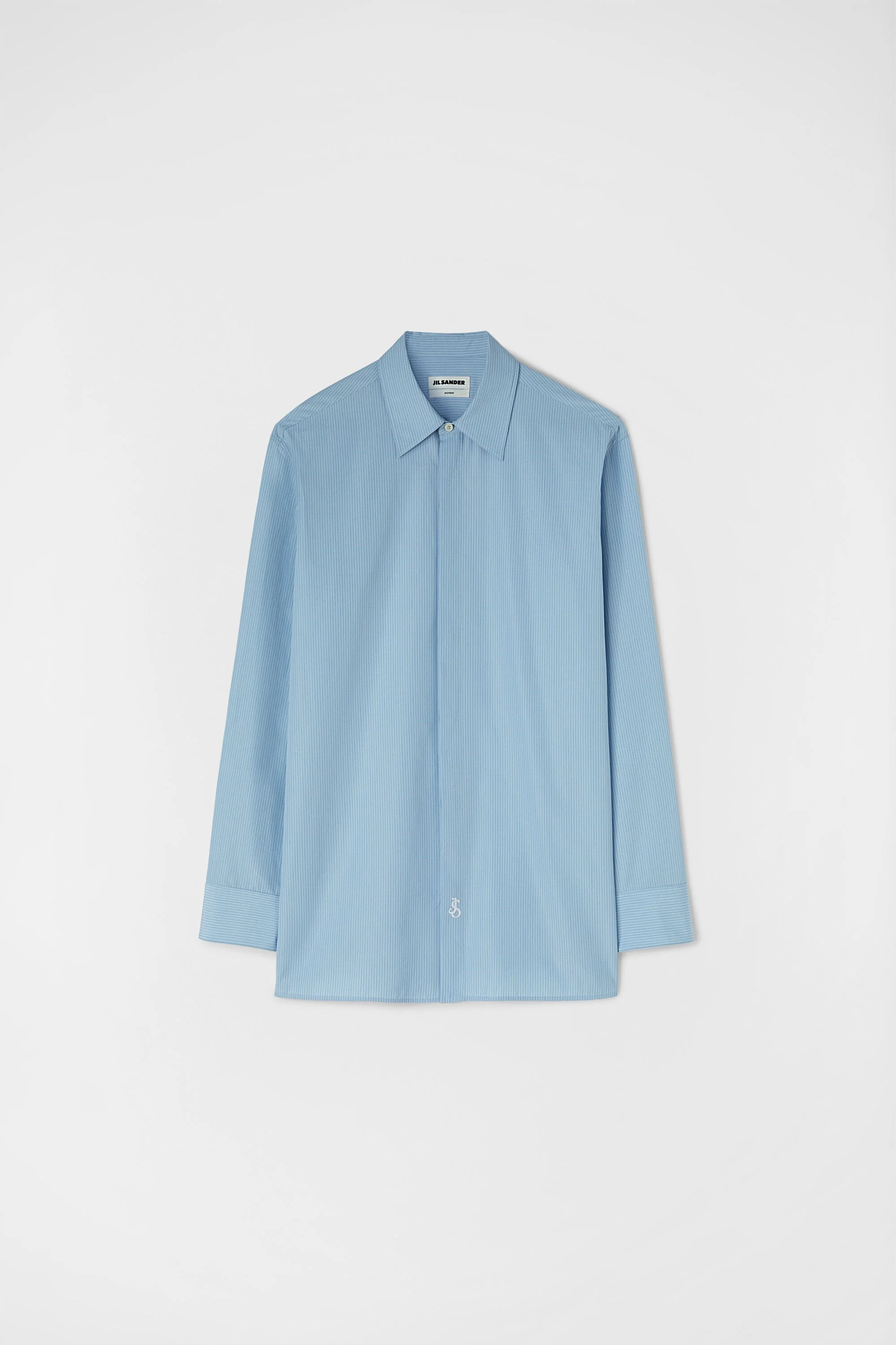 Cotton straight-fit shirt with pointed collar and embroidered Jil Sander monogram Details - straight fit - one-button collarstand - classic yoke - concealed button front closure - one-pleat sleeves with one-button cuffs - staight hem - embroidered Jil Sander monogram - 100% cotton - made in Italy - StyleID: J24DL0103J45174494 Care - dry clean only - iron with care Fit - model is 187cm/6'1" and is wearing a collar size 40