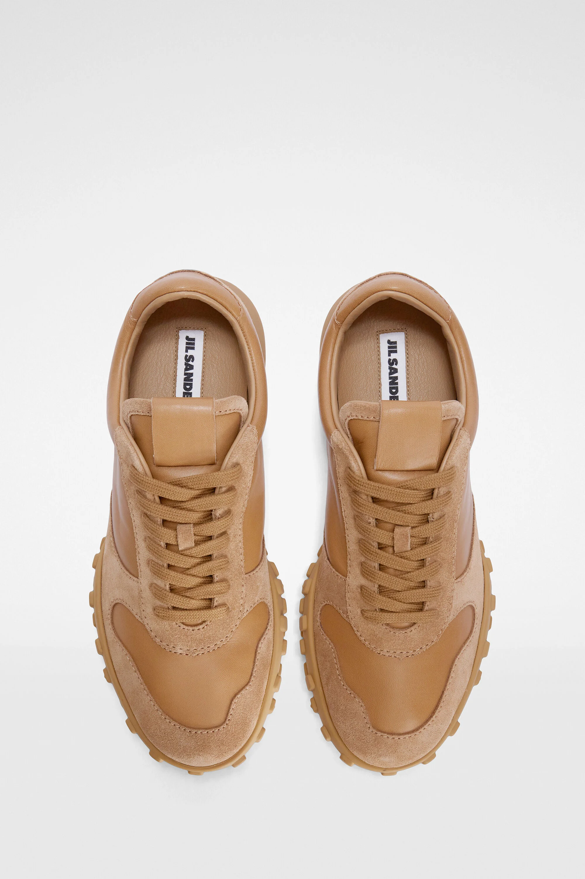 Low-top nappa leather and suede sneakers with rubber pebble outersole Details - round toe and lace-up front - nappa leather upper with suede trims - nappa lining - rubber pebble outersole with embossed Jil Sander logo - fabric tongue with leather patch - Jil Sander logo embossed on back tab - Jil Sander logo branded insole - 100% calf leather - made in Italy - StyleID: J32WS0056P7394235