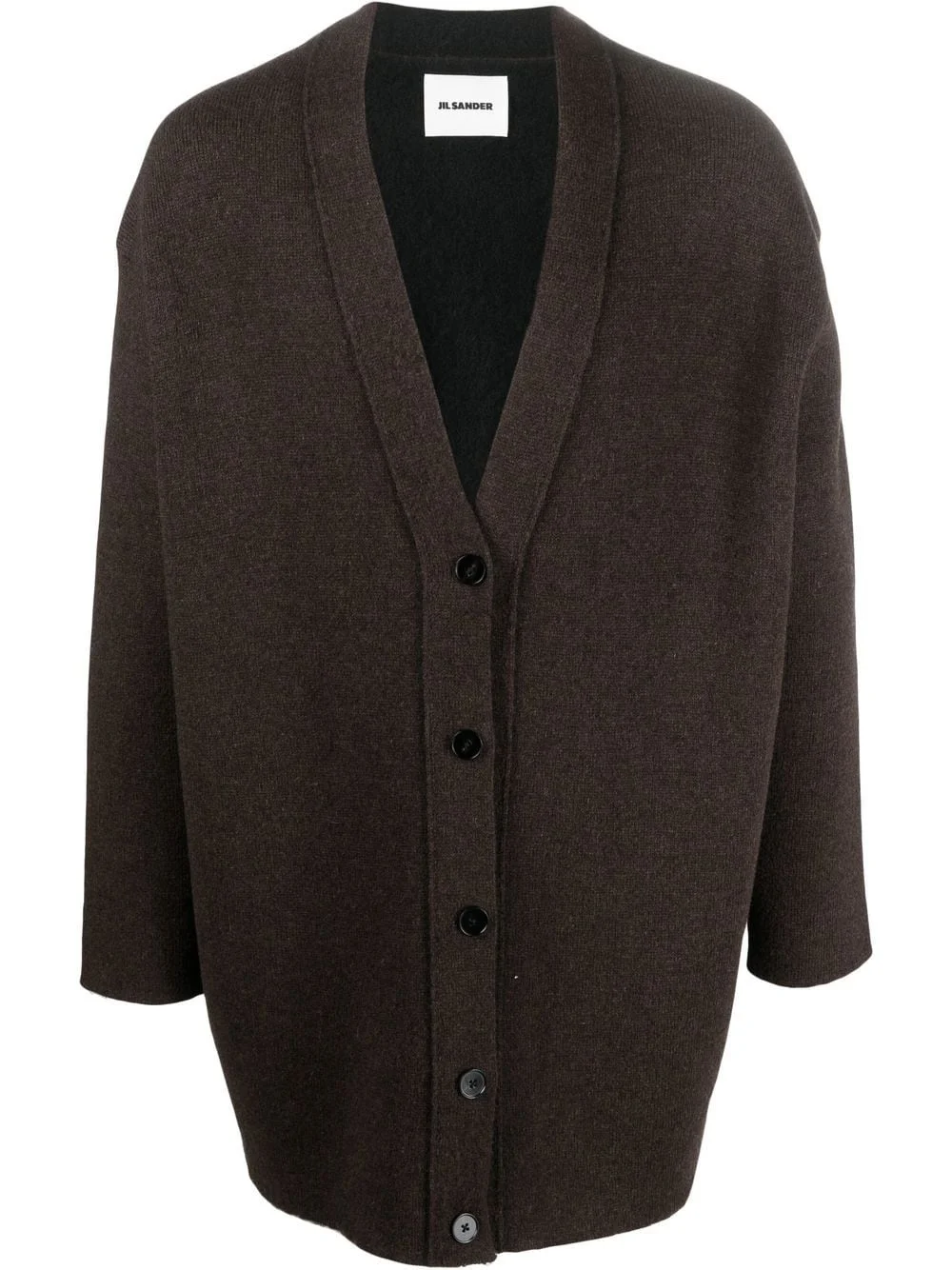 oversize V-neck cardigan brown wool-mohair blend knitted construction front button fastening V-neck drop shoulder long sleeves long length straight hem Made in Italy Composition Wool 70%, Mohair 20%, Polyamide 10% SIZE & FIT Model measurements Height 6 ft 2 in(1.87 m) Bust/Chest 37 in(94 cm) Hips 33.85 in(86 cm) Waist 27.95 in(71 cm) FittingInformation This piece fits true to size. We recommend you get your regular size Cut for a loose fit Made with a mid-weight fabric Washing instructions Dry Clean Only