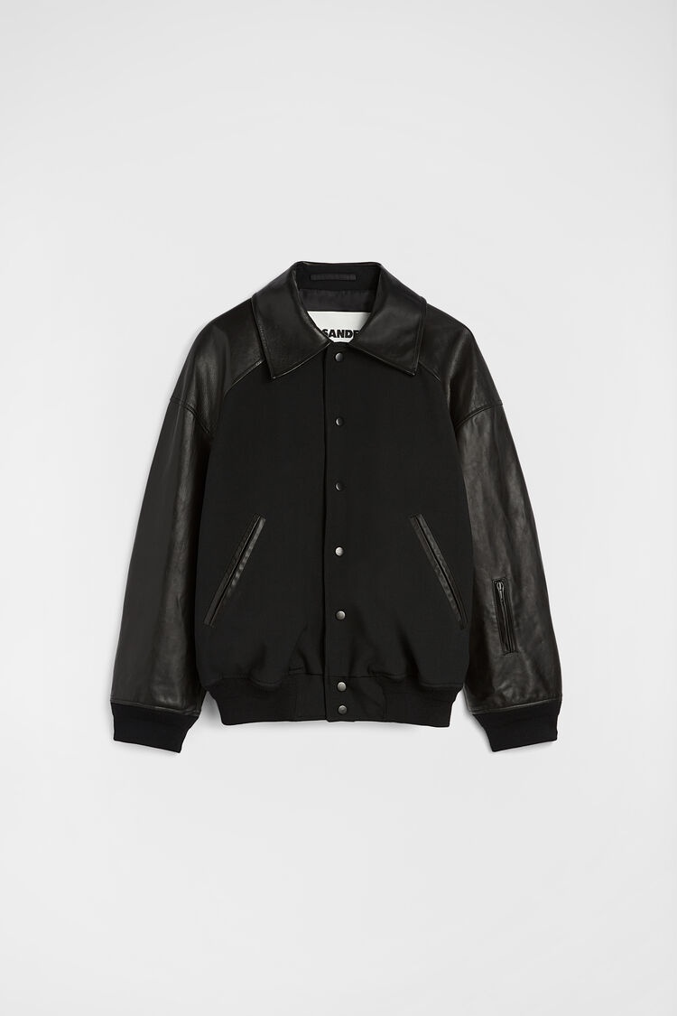 Fully-lined textured wool jacket with leather sleeves and collar Details - oversized fit and dropped shoulders - leather flat pointed collar - centre-front snap button closure - two welt pockets - ribbed cuffs and hem - viscose lining - textured wool tailoring - body 100% wool, contrast 100% calf leather - made in Italy - StyleID: J21SW0050J40160001 Care - dry clean only - iron with care Fit - model is 187cm/6'1" and is wearing a size 48 IT - Please note that the physical label of the item will show the Italian size