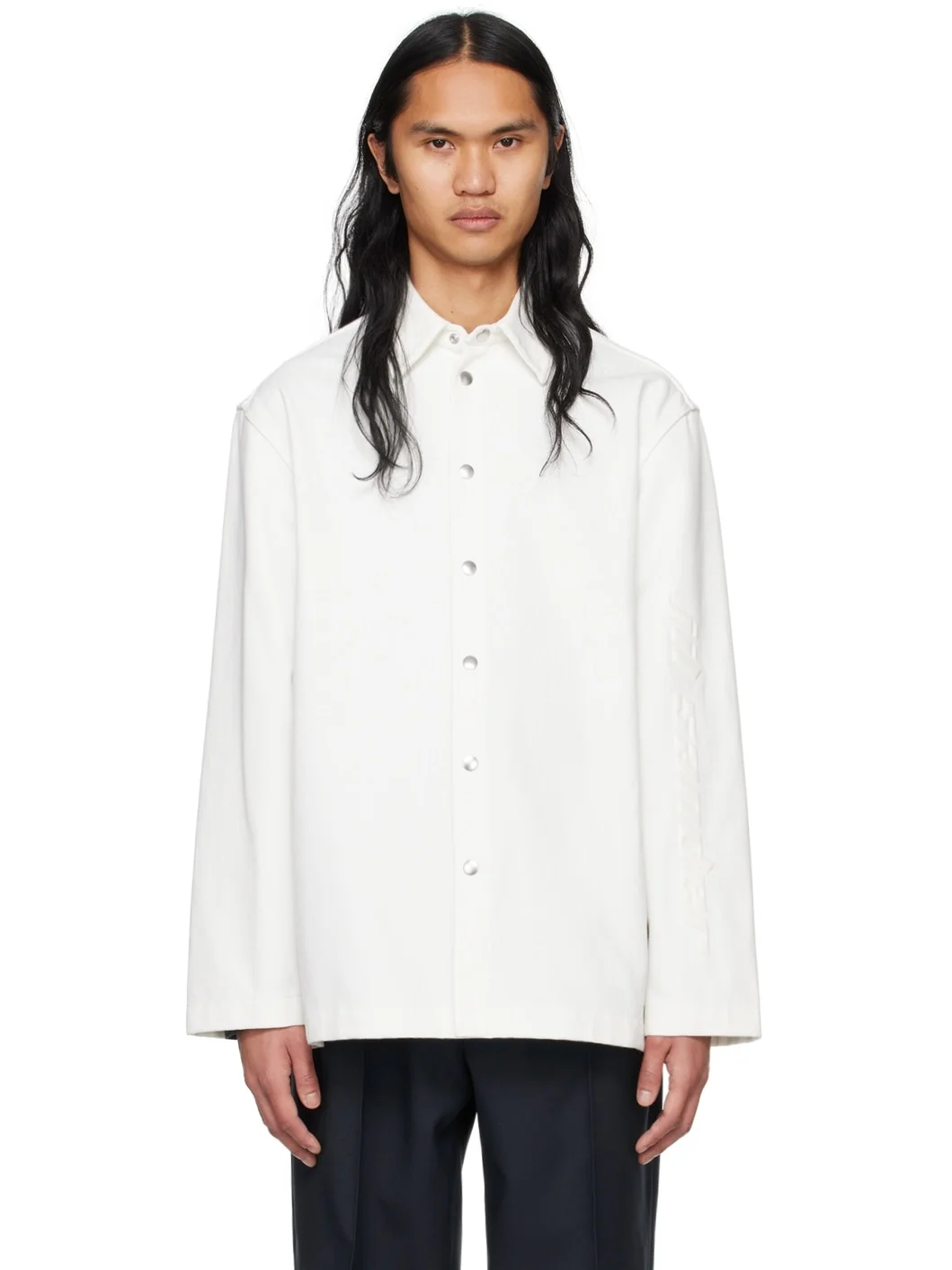 Non-stretch denim shirt. · Spread collar · Press-stud closure · Logo embossed at sleeve · Partial cotton sateen lining Supplier color: Porcelain 100% cotton. Made in Italy 241249M192020
