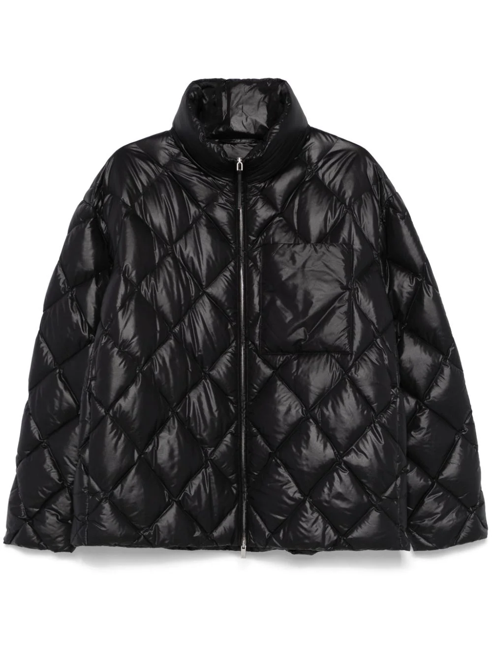 padded jacket Highlights - Black - High-shine finish - Front two-way zip fastening - Funnel neck - Concealed hood - Diamond quilting - Chest patch pocket - Long sleeves - Two side zip-fastening pockets - Down-feather filling - Full lining - Straight hem Made in Italy Composition Lining: Polyamide 100%, Polyester 100%, Goose Down 85%, Goose Feather 15% Outer: Polyamide 100% SIZE & FIT Model measurements Height 6 ft 2 in(1.87 m) Bust/Chest 37.79 in(96 cm) Hips 37.79 in(96 cm) Waist 30.31 in(77 cm) FittingInformation Designed for a relaxed fit, this piece allows for comfort and movement when worn The internal drawstring at the hem allows for fitted preferences Made from a quilted non-stretch fabric, giving it no natural elasticity
