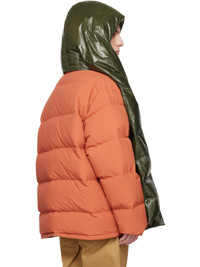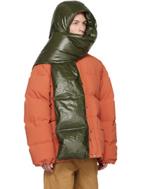 Down-filled quilted nylon taffeta scarf in green. · Integrated hood with drawstring and zip collar · H8 x W76 in Available exclusively at SSENSE. Supplier color: Medium green Fill: 85% goose down, 15% goose feather. 100% polyamide.