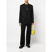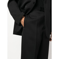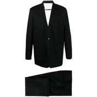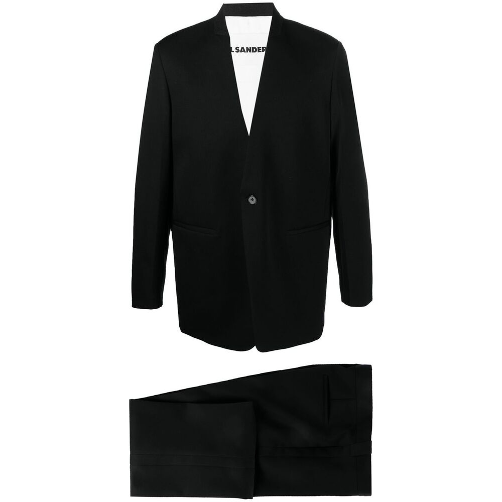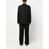 Jet black wool-cotton blend Jacket no lapels front button fastening long sleeves two front welt pockets straight hem Trousers concealed front zip fastening two side slit pockets straight hem.
