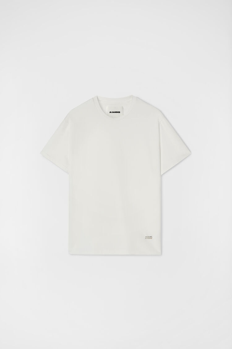 Cotton crew-neck short-sleeved t-shirt with back carré detail and detachable silver Jil Sander logo pin Details - crew neck - carré detail on back - detachable Jil Sander logo pin - primary fabric: 100% cotton - StyleID: J22GC0128J20073102 Details - model is 187cm/6'1" and is wearing a size M