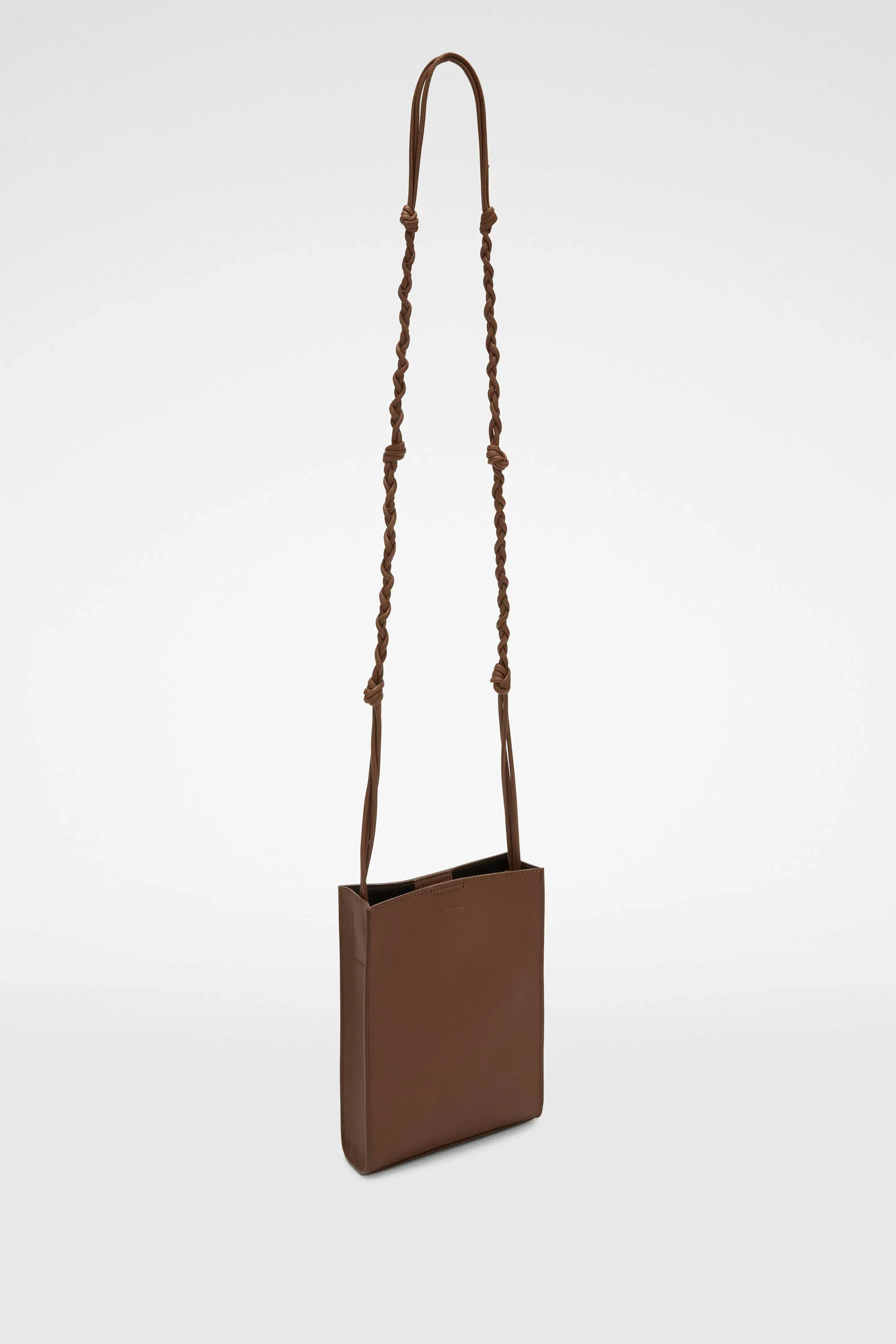 Small-sized leather shoulder and crossbody bag with hand-knotted strap and embossed Jil Sander logo Details - hand-knotted strap - rectangular shape - magnetic button closure - nappa lining - blind embossed Jil Sander logo - 100% calf leather - w 14 cm x h 19 cm x d 5 cm - made in Italy - StyleID: J25WG0003P5995214