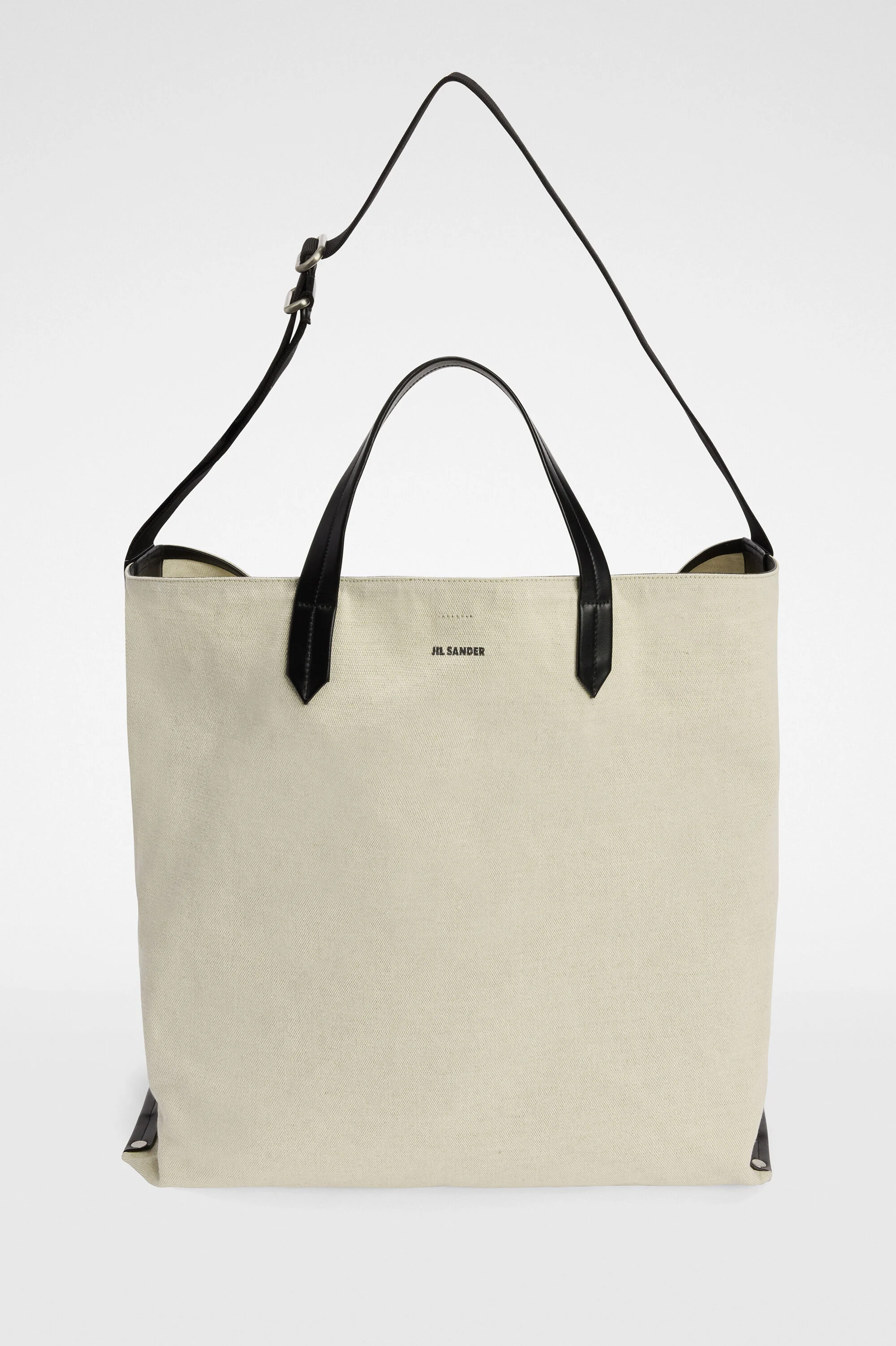 Medium-sized canvas tote bag with printed Jil Sander logo Details - squared shape - two leather handles - adjustable crossbody strap - snap button closure - inner leather pocket and two card slots - printed Jil Sander logo - calf leather trim - 70% cotton 30% linen - made in Italy - StyleID: J25WC0002P4917280