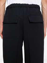 tapered trousers Highlights - Black - Wool - Textured finish - Vertical seamed - Two side welt pockets - Two rear flap pockets - Tapered leg - Elasticated waistband Made in Italy Composition Lining: Cotton 100%, Viscose 100% Outer: Wool 100% SIZE & FIT Model measurements Height 6 ft 2 in(1.88 m) Bust/Chest 36.61 in(93 cm) Hips 35.82 in(91 cm) Waist 27.95 in(71 cm) FittingInformation Designed for a tapered leg, offering a loose unrestricted fit over the leg with a closer fit towards the ankle Adjust this piece’s waistband to your preference using the drawstring Made from a midweight non-stretch fabric This piece fits true to size – take your usual size