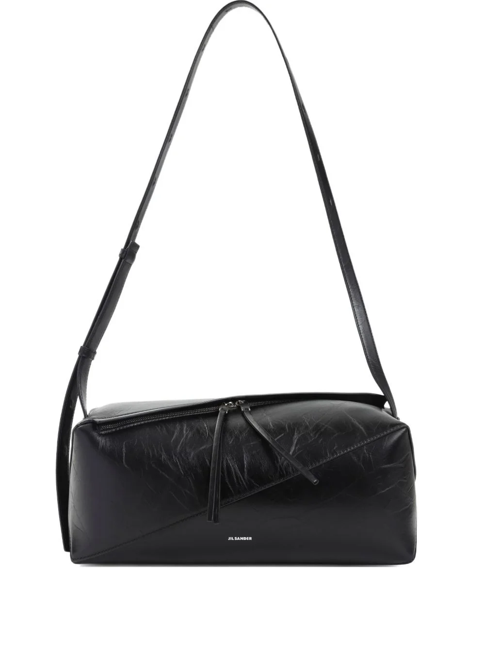 diagonal-zip leather shoulder bag Highlights - Black - Leather - Diagonal seam detail - Zip fastening - Rectangular shape Made in Italy Composition Leather 100% SIZE & FIT Measurement DEPTH 5.11 in(13 cm) HEIGHT 5.11 in(13 cm) WIDTH 12.59 in(32 cm)