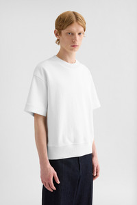 Short-sleeved cotton t-shirt with knitted collar and hem and embroidered Jil Sander monogram Details - oversized fit and boxy shape - dropped shoulders - ribbed knitted collar and hem - Jil Sander monogram embroidered on left hem - viscose lining - soft compact cotton jersey - 100% cotton - made in Italy - StyleID: J22GC0225J20245100 Care - dry clean only - iron with care Fit - model is 187cm/6'1" and is wearing a size 48 IT - Please note that the physical label of the item will show the Italian size