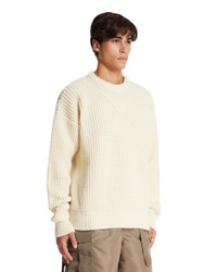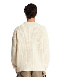 Jil Sander White Openwork Sweater. White virgin wool, crewneck, openwork detail, long sleeves, dropped shoulders, knit construction, straight hem. Pedro is 185 cm and he is wearing size 50. DETAILS Model: J22GP0249J14787106 Composition: 100% Virgin Wool Made in: ITALY Season: FW25-26