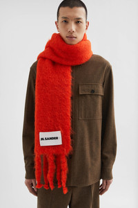 Long handknit wool and mohair scarf with Jil Sander+ logo label Details - fringed hem detail - Jil Sander+ logo label stitched at bottom - 73% mohair 24% wool 3% polyamide - made in Spain - StyleID: J47TE0113J40041624 Care - dry clean only - iron with care