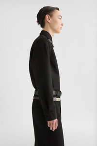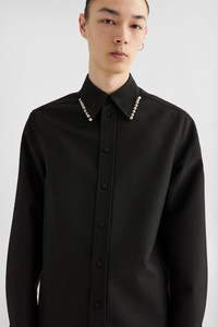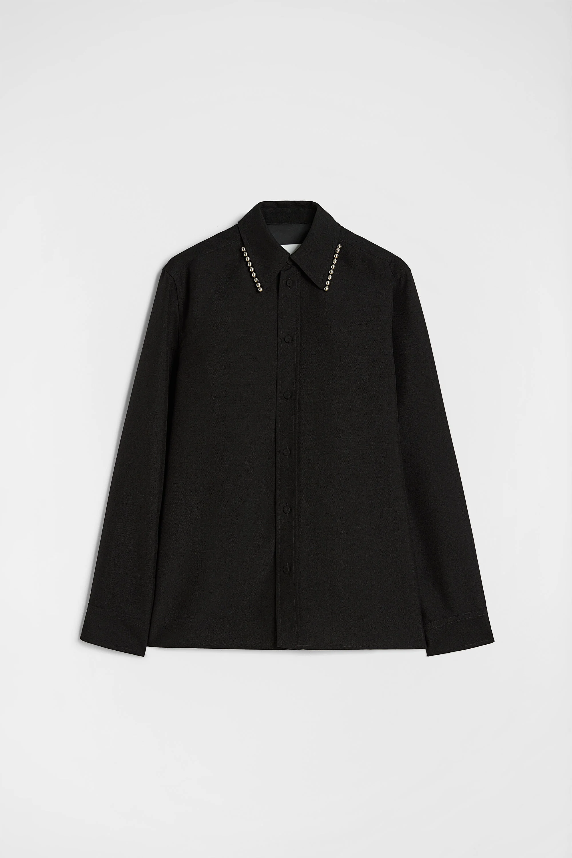 Long-sleeved virgin wool and mohair shirt with metal beads at collar Details - regular fit and straight cut - classic collar with metal beads - centre-front button closure - classic yoke - long sleeves with one pleat and one-button cuffs - straight hem - viscose lining - virgin wool and mohair blend - 70% wool 30% mohair - made in Italy - StyleID: J21DL0259J40290001 Care - dry clean only - iron with care Fit - model is 187cm/6'1" and is wearing a collar size 40