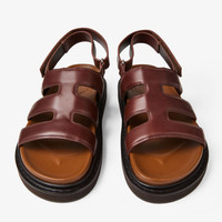 Details, Care & Fit Crafted from chestnut waxed calf leather, the Cove sandal is built using a layered construction for a clean finish. Wide cut-outs enhance breathability, while the ergonomic insole, made from a recycled compound, adds cushioning and support. Set on a lightweight sole, finished with an adjustable strap and the Jimmy Choo logo. - Waxed calf leather - Recycled compound - Cut-outs - Ergonomic insole - Adjustable strap - Jimmy Choo logo - Made in Spain - This product was made using leather from tanneries receiving Leather Working Group Gold or Silver-Certification in recognition of their environmental performance