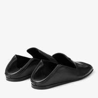 Details, Care & Fit A modern take on the classic smoking slipper, the Eliot Slipper is crafted from soft buffalo leather, specially treated to create a natural "vintage" effect. Set on a flat sole with a non-slip finish, it features a squared toe, notched vamp and smooth leather lining with soft padding that naturally moulds to the foot, creating a pillowy fit. A collapsible back provides added versatility and comfort. The upper is finished with a discrete JC monogram embellishment, a hallmark of quality and craftsmanship. - Soft buffalo vintage leather - Collapsible back - Square toe - Leather lined - Leather sole - Notched vamp - Non-slip sole - Soft foam padding - Made in Italy - By purchasing this product, you are supporting sustainable leather manufacturing through the Leather Working Group