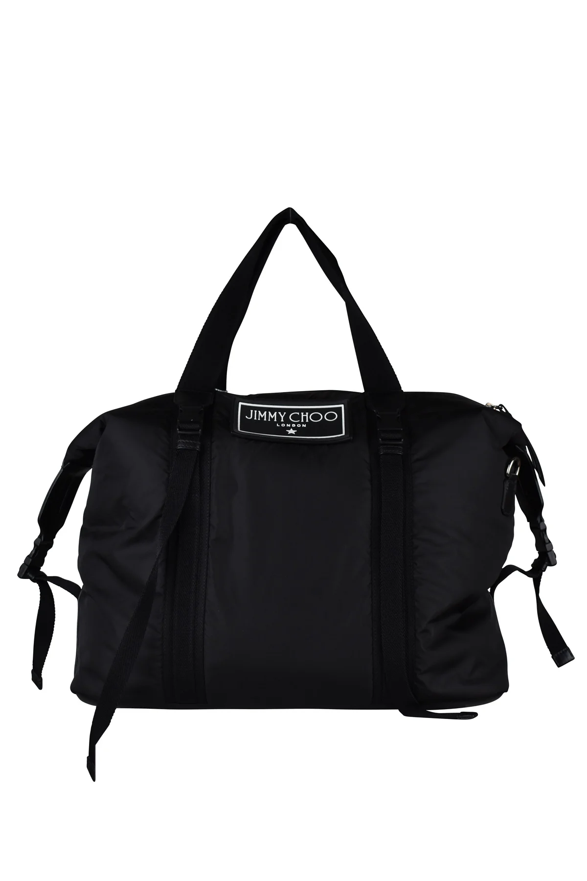 Jimmy Choo Arlington tote bag in black nylon. Two nylon handles. A handle to wear as a shoulder bag. Two nylon straps on detachable. Jimmy Choo silver logo on the front. Zipper closure. Interior fabric pocket. 100% cotton. Made in Italy.