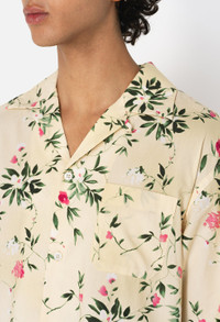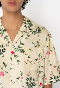 Graphic 'Mizuki' print camp shirt in newly developed cotton / rayon blend fabric that's knit for a soft, smooth hand. This shirt features a button placket, chest pocket, and point collar. The relaxed, easy silhouette is designed to elevate any fit, whether paired with semi-formal trousers or more casual shorts. Fits boxy by design. If you prefer a slimmer fit, it's possible to size down. 57% Cotton 43% Rayon. FABRIC & FIT Fits boxy by design. If you prefer a slimmer fit, it's possible to size down. Model is 6'1" 160 lbs and wears a size 2 / Medium. CARE GUIDE Machine Wash Cold, Wash With Like Colors, Do Not Bleach, Do Not Iron, Do Not Tumble Dry