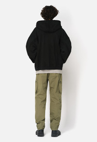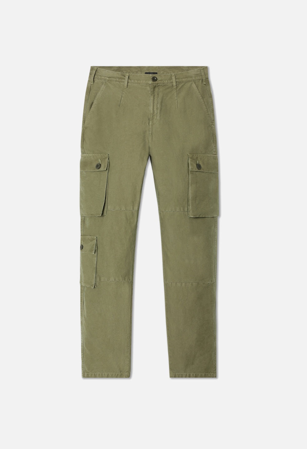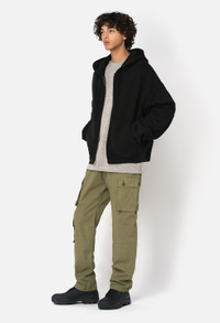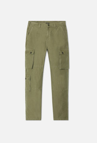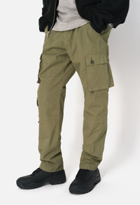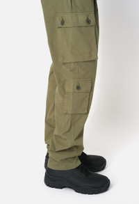 Relaxed fit straight leg pants in lightweight cotton poplin fabric for warmer climates. Garment dyed and stonewashed. Seven pocket styling with two pockets at the front, welt pockets at the seat, and three cargo pockets at the legs. Paneled construction at the knees. Zip closure waist with waistband loops and darts. Made in Japan. This pant is based off the blocks of a vintage German border security uniform. Our design studio has made subtle tweaks over a year of development to dial in and perfect the fit. Each piece is made start to finish in Japan. The dye and wash process creates softness and fading at the seams. 100% Cotton. FABRIC & FIT Fits true to size, take your normal size.Model is 6'1" and wears a size 2 / Medium. CARE GUIDE Machine Wash Cold, Wash With Like Colors, Do Not Bleach, Do Not Iron, Do Not Tumble Dry