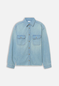 Relaxed-fit work shirt in 2X1 indigo denim with a light vintage wash. Raw hem design with a slightly cropped fit. This shirt features a button closure, flap pockets at the chest, spread collar, barrel cuffs, and a box pleat at the back yoke. Contrast tobacco stitching. Made in Japan. 100% Cotton. FABRIC & FIT Fits true to size, take your normal size. CARE GUIDE Machine Wash Cold, Wash With Like Colors, Do Not Bleach, Do Not Iron, Do Not Tumble Dry