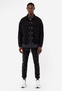 Stretch leather pants crafted from premium vegetable tanned European hide. Drop crotch rise with a slim fit that tapers from the knee down. These pants feature knee panels, a zip closure at the back pocket, and an adjustable cinch cord at each hem. Individually finished with a hand-wax treatment throughout. Lined interior. Riri hardware. Made in Los Angeles. Our best-selling Escobar silhouette reaches cutting-edge boundaries. This classic style has been elevated with European hide, Japanese trim, and Riri hardware. Individually garment washed and then finished by hand with a natural wax process that will only look better with age. Due to the special treatment on this garment, each piece is completely unique, with slight variance in finish. Self: 100% Leather. Lining: 97% Cotton / 3% Lycra. Explore Details FABRIC & FIT This item is intended to fit slim. If you do not prefer a slim fit, we recommend sizing up one. Model is 6'2" 160 lbs with a 30" waist and wears a size 2 / Medium. CARE GUIDE Specialist clean.