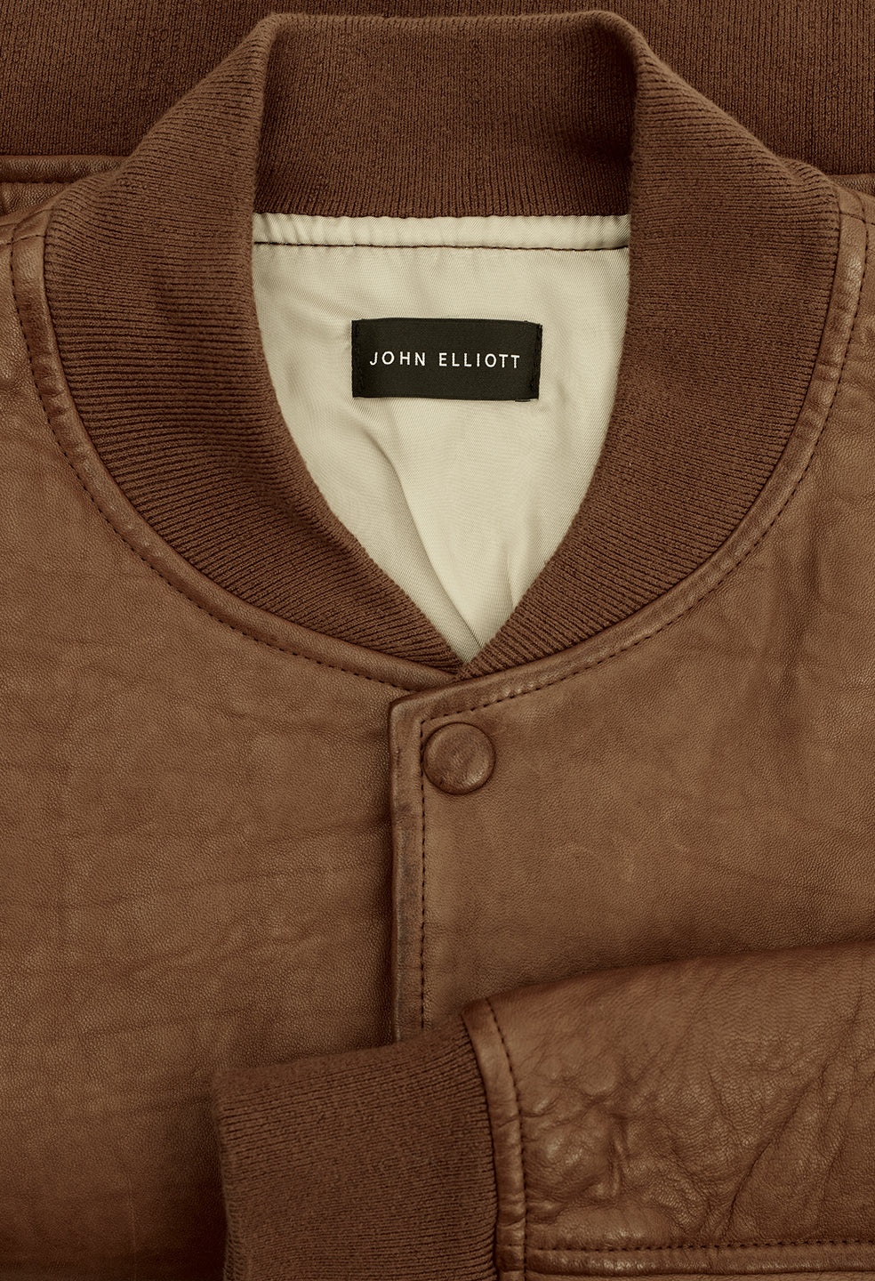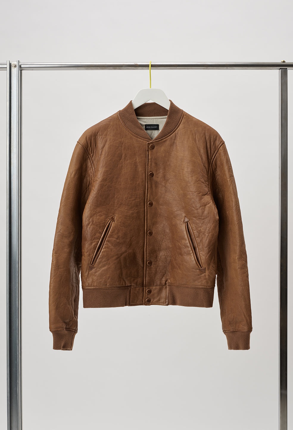 Classic stadium jacket in premium vegetable dyed French lamb. Leather trimmed snap button closure. Two welt pockets at the front. Darts at the back shoulders. Rib knit collar, hem, and sleeve cuffs. Satin lined interior. Made in Los Angeles. Due to the wash and wax treatment on this garment, each piece is completely unique, with slight variance in finish. 100% Leather. FABRIC & FIT Fits true to size, take your normal size. Model is 6'2" 160 lbs and wears size 2 / Medium. CARE GUIDE Specialist clean.