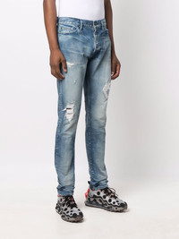 mid-rise distressed jeans blue cotton-blend distressed effect stonewashed belt loops front button and zip fastening classic five pockets Imported Composition Cotton 98%, Polyurethane 2% SIZE & FIT Model measurements Height 6 ft 2 in(1.89 m) Bust/Chest 35.43 in(90 cm) Hips 36.61 in(93 cm) Waist 28.74 in(73 cm)