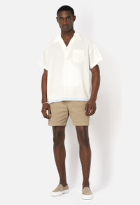 Relaxed fit pullover camp shirt. This shirt features a spread collar with single button placket, chest pocket, and notched hem with contrast trim. Lightweight cotton / modal blend fabric that's knit for a soft, smooth hand. Fits boxy by design. 50% Cotton, 50% Modal. FABRIC & FIT Fits true to size, take your normal size.Model is 6'2" and wears a size 2 / Medium. CARE GUIDE Machine wash cold / Do not bleach / Cool iron / Do not tumble dry / Hang dry