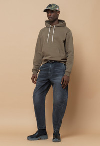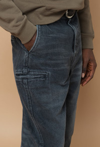 Relaxed and cropped fit denim trousers. Japanese 3X1 denim in 90's inspired black wash. Subtle distressing throughout. Asymmetrical seams are designed to create shape. These pants feature two slant pockets at the front, two welt pockets at the back, and a welt pocket at the side. Belt loops at the waist. Zip fly. Made in Japan. Sendai Trousers are now offered in traditional numbered sizing. We suggest to take your true size. 100% Cotton. FABRIC & FIT Sendai Trousers are now offered in traditional numbered sizing. We suggest to take your true size. Model is 6'2" 160 lbs with a 31" waist and wears a size 31. CARE GUIDE Machine Wash Cold, Wash With Like Colors, Do Not Bleach, Do Not Iron, Do Not Tumble Dry