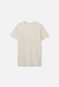 Classic fit tee with unfinished edges and a hem cut slightly longer in front than the back. Finished with a baby cover stitch at the neckline. Made in Japan. Silk Noil fabric is crafted from upcycled silk fibers, known for their natural slub and irregular texture. The noil process uses dropped silk — short fibers left behind in traditional spinning — creating a fabric with a dry hand, matte finish, and organic character. 75% Cotton, 25% Silk. FABRIC & FIT We recommend going true to size. CARE GUIDE Hand Wash, hang dry.