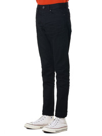 John Elliot Japanese dry-processed 3x1 five-pocket denim pant in jet black, button closure, zipped fly, cropped slim tapered leg, low-waist rise, tonal stitching. Made in the United States. Composition - Cotton Blend Model is 6ft 1” and wearing a size 30. Shoulders: 17” Chest: 33” Waist: 30”