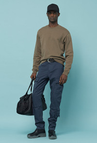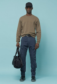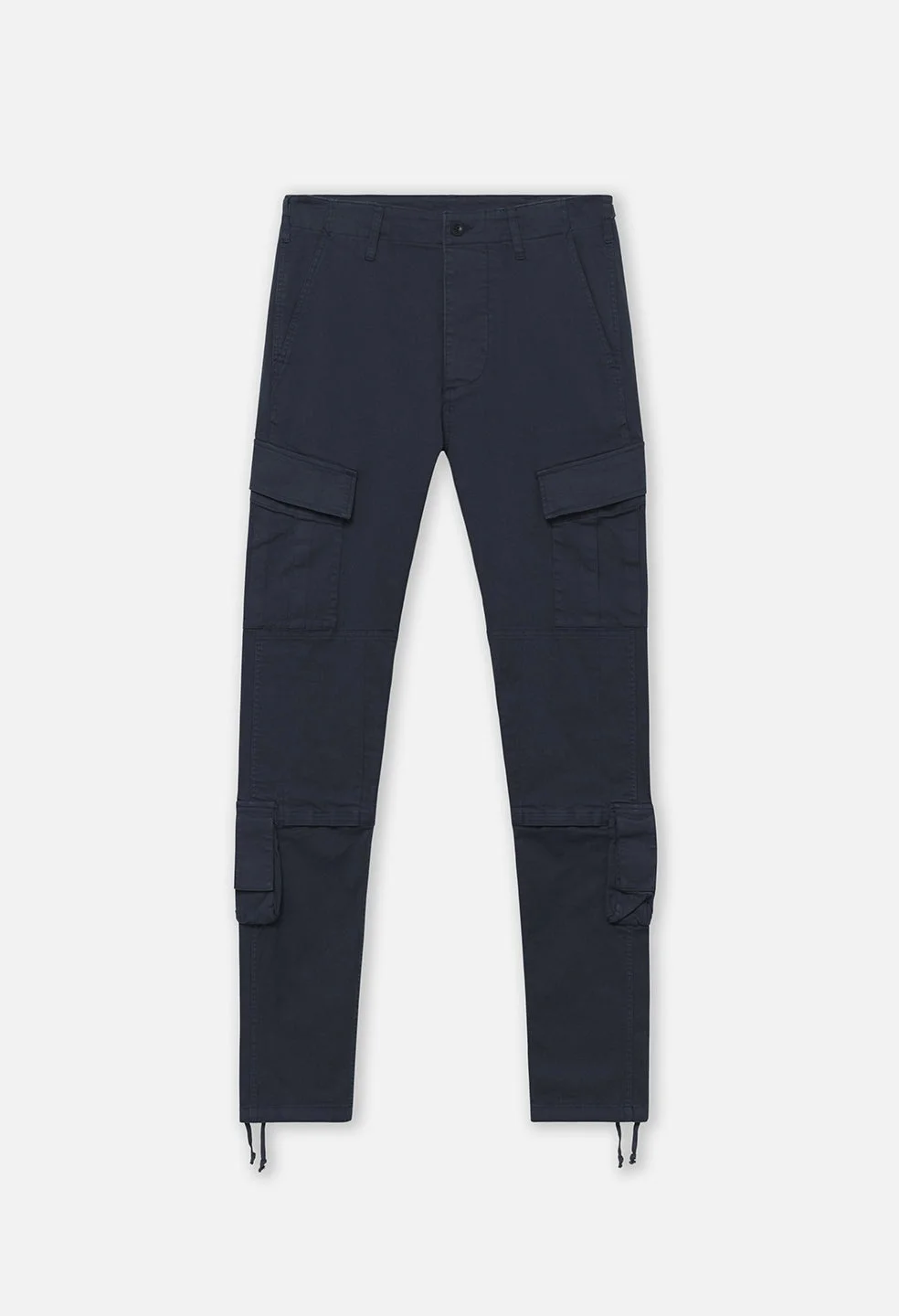 Slim fit cargo pants in heavyweight stretch twill fabric that looks and feels like military canvas while providing unique comfort. Stonewashed. These pants feature double-walled knee pleats, two slant pockets at the front, two triple pleated cargo pockets at the sides, two flap pockets at the seat, as well as two dual-use cargo pockets on the lower leg—one with a discreet velcro opening and the other with a zipper. Making these even more optimal, the bottom of the knee pleats feature a hidden pocket with subtle velcro closure. Adjustable cinch waistband with belt loops. Button fly. Ties at the hems for an adjustable fit. 95% Cotton, 5% Polyurethane. FABRIC & FIT Fits true to size, take your normal size. Model is 6'1" 160 lbs and wears a size 2 / Medium. CARE GUIDE Machine Wash Cold, Wash With Like Colors, Do Not Bleach, Do Not Iron, Do Not Tumble Dry