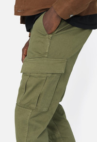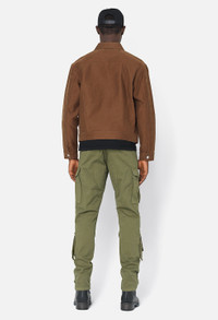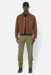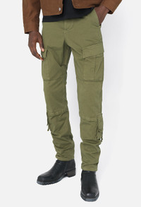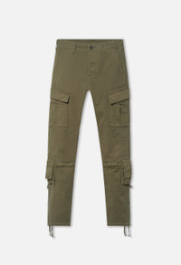 Slim fit cargo pants in heavyweight stretch twill fabric that looks and feels like military canvas while providing unique comfort. Stonewashed. These pants feature double-walled knee pleats, two slant pockets at the front, two triple pleated cargo pockets at the sides, two flap pockets at the seat, as well as two dual-use cargo pockets on the lower leg—one with a discreet velcro opening and the other with a zipper. Making these even more optimal, the bottom of the knee pleats feature a hidden pocket with subtle velcro closure. Adjustable cinch waistband with belt loops. Button fly. Ties at the hems for an adjustable fit. 95% Cotton, 5% Polyurethane. FABRIC & FIT Fits true to size, take your normal size.Model is 6'2" 160 lbs and wears a size 2 / Medium. CARE GUIDE Machine Wash Cold, Wash With Like Colors, Do Not Bleach, Cool Iron, Do Not Tumble Dry.