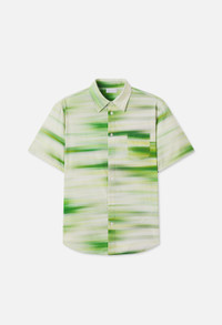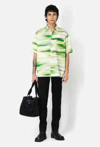 Short sleeve button up shirt in cotton / rayon blend fabric that's knit for a soft, smooth hand. This shirt features a curved hem, button placket, chest pocket, barrel cuffs, and a point collar. Exploring the idea of people on the move, three styles highlight Motion Meadow, featuring the same artwork at different speeds. The SS Cloak Button Up iteration is the 'fast' representation of the 'Meadow' print. 57% Cotton 43% Rayon. This shirt fits large to size. If you prefer a slimmer fit, we suggest to size down. Please refer to measurements in our size & fit guide. FABRIC & FIT This shirt fits large to size. If you prefer a slimmer fit, we suggest to size down. Please refer to measurements in our size & fit guide. Model is 6'1" 160 lbs and wears a size 2 / Medium. CARE GUIDE Machine Wash Cold, Wash With Like Colors, Do Not Bleach, Do Not Iron, Do Not Tumble Dry