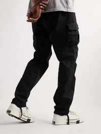 John Elliott's cargo trousers have a relaxed straight cut and gusseted knees for a more comfortable, natural fit. They're made from soft black sateen and feature drawstrings at the elasticated waistband and hems to adjust the fit. Size & Fit - Fits true to size. Take your normal size - Regular-straight leg, low-crotch style - Adjustable at the waist - Drawcord hem - Lightweight, non-stretchy fabric - Model is shown wearing a M - Model measures: waist size 32, height 6'2"/ 188cm Details & Care - Black sateen - 100% polyester; trim: 100% nylon; lining: 100% polyester - Machine wash