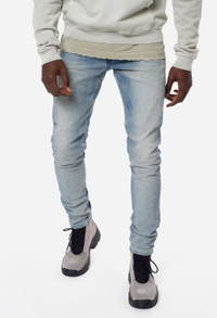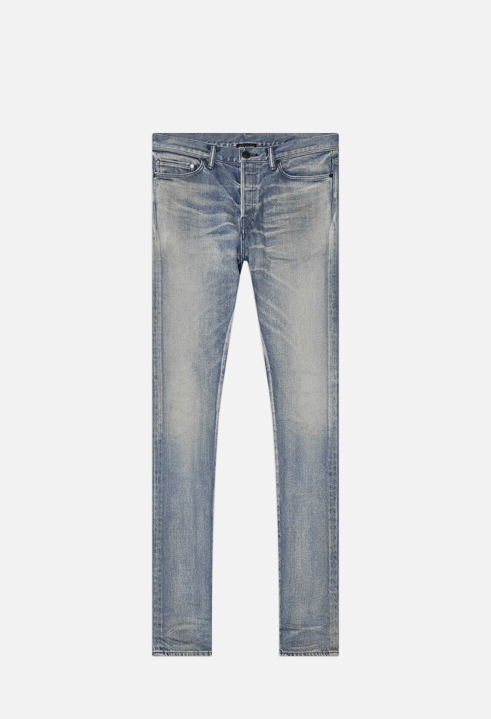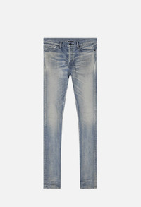 Japanese dry process 3x1 stretch denim in medium faded indigo. Slim tapered fit with a low rise in the front and higher rise in the back. 98% cotton 2% poly. FABRIC & FIT This item is intended to fit slim. If you do not prefer a slim fit, we recommend sizing up one. Model is 6'2" 160 lbs with a 31" waist and wears a size 31. CARE GUIDE Machine wash cold, gentle cycle. Hang to dry. Dry clean optional.