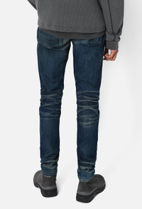 Japanese dry process 3x1 stretch denim in dark faded indigo. Slim tapered fit with a low rise in the front and higher rise in the back. 98% Cotton 2% Poly. Explore our Denim Wash Guide FABRIC & FIT This item is intended to fit slim. If you do not prefer a slim fit, we recommend sizing up one. Model is 6'2" 160 lbs with a 31" waist and wears a size 31. CARE GUIDE Machine wash cold, gentle cycle. Hang to dry. Dry clean optional.