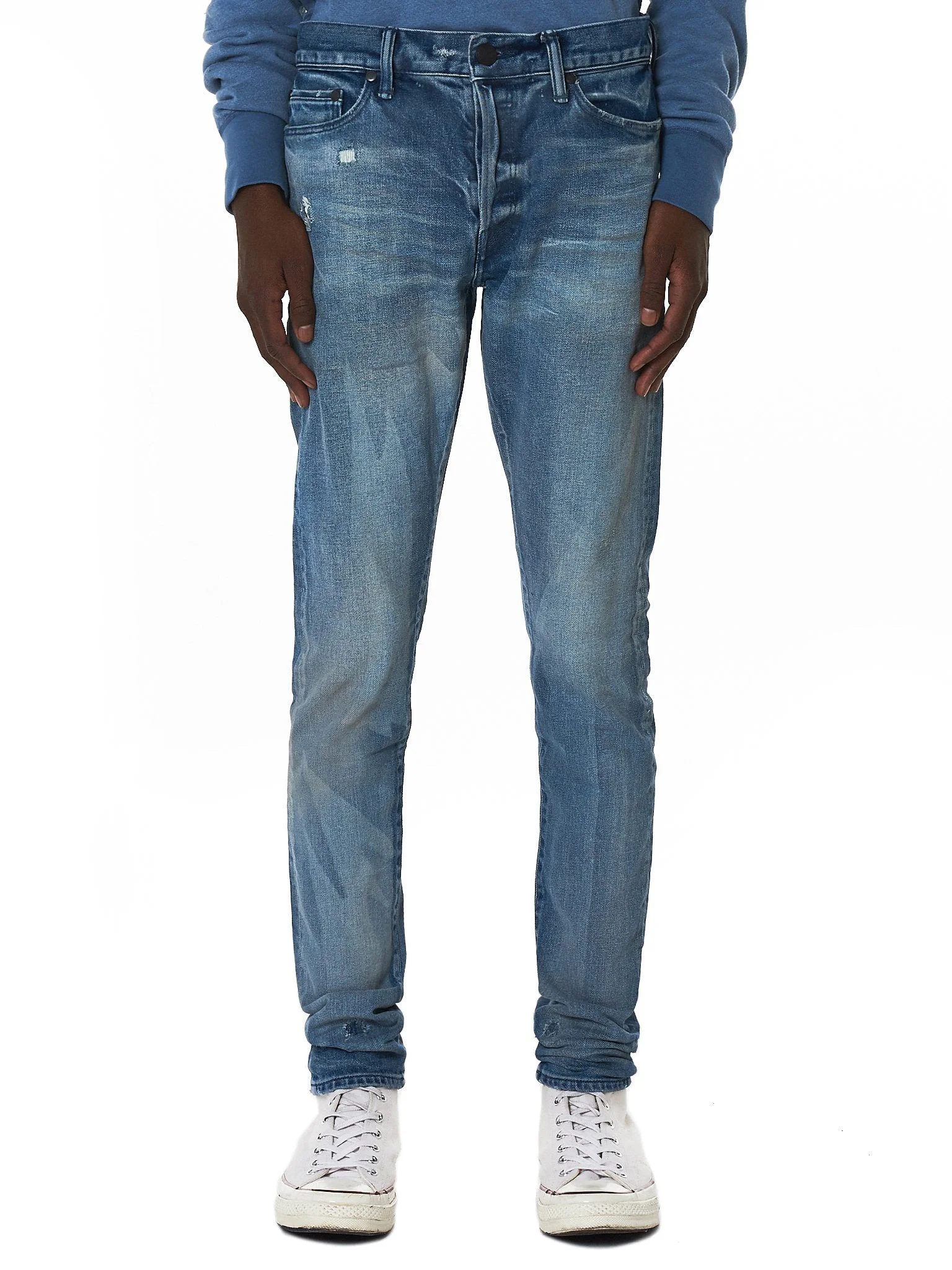 John Elliot slim-fit five-pocket Japanese dry-processed 3x1 denim pant in washed indigo, low-waist rise, front button closure, repaired distressing at thigh, stacked bottom hem, contrast stitching. Composition - 98% Cotton, 2% Polyester