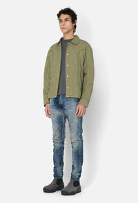 When sizing, please note: This denim features the original Cast 2 fit, incorporated into all our pairs from 2016- Fall 2021. The fit is slightly slimmer, most notably in the mid-thigh, than other 'Cast 2' denim on our site. Please check measurements in our size guide carefully. Japanese 3x1 woven stretch denim in light indigo. Features intricate hand-sanded whiskering, distressing, and subtle repairs with 3D creases, paint, and oil stains at the hems. Five pocket design with a button fly. Slim tapered fit with a low rise in the front and higher rise in the back. Contrast stitching. Made in Japan. 'Charlie' is a 10-year wash, based on the early era of forming John Elliott. Years ago, John worked with a two-person sampling room, where on the side flatheads and panheads were being tuned and restored. The paint detailing, repairs, and oil stains on this wash authentically reference a vintage pair from that time. 98% Cotton / 2% Poly. FABRIC & FIT This denim features the original Cast 2 fit, incorporated into all our pairs from 2016- Fall 2021. The fit is slightly slimmer, most notably in the mid-thigh, than other 'Cast 2' denim on our site. Please check measurements in our size guides carefully. Model is 6'2" 160 lbs with a 31" waist and wears a size 31. CARE GUIDE Machine Wash Cold, Wash With Like Colors, Do Not Bleach, Do Not Iron, Do Not Tumble Dry