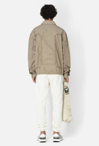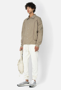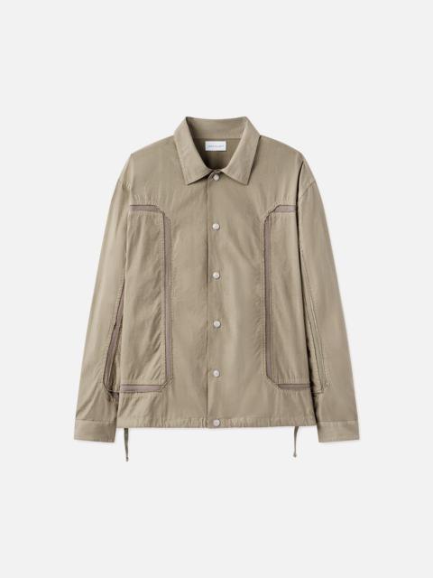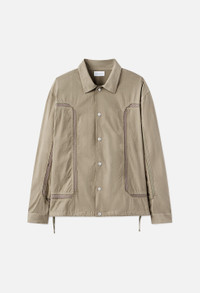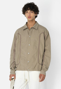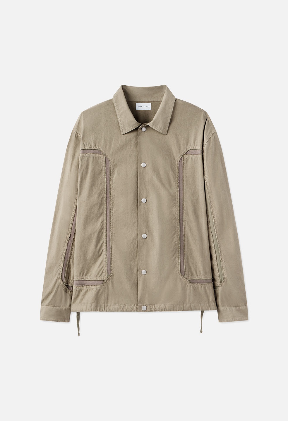 Relaxed fit shirt in lightweight cotton poplin combined with heavy herringbone tape. This shirt features a snap button closure, barrel cuffs, and a point collar. The shirt's hem includes a cinching system to adjust styling. Rivet detailing throughout. The Vintage Frame Collection combines heavy herringbone tape with soft long-staple cotton poplin, adding tonal geometry and structure to each garment. Our wash process slightly shrinks the tape, resulting in a unique puckering effect. Hems are unpicked at the tape seams to reveal raw edge detailing and textural contrast. 100% Cotton. FABRIC & FIT Fits true to size, take your normal size.Model is 6'1" 160 lbs and wears a size 2 / Medium. CARE GUIDE Machine Wash Cold, Wash With Like Colors, Do Not Bleach, Do Not Iron, Do Not Tumble Dry