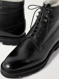 John Lobb's lace-up boots draw inspiration from rugged, traditional derbies and 1940s ski styles from the brand's archives. Made in the United Kingdom from smooth leather polished for a high-shine finish, this pair is lined in warm faux shearling and set on a slight heel. The metal eyelets that trace the front will help to ensure a secure fit. Size & Fit - Fits true to size. Take your normal size - UK sizing - Medium width = UK E/US D Details & Care - Black polished-leather (Calf), off-white faux shearling - Lace-up - Made in United Kingdom