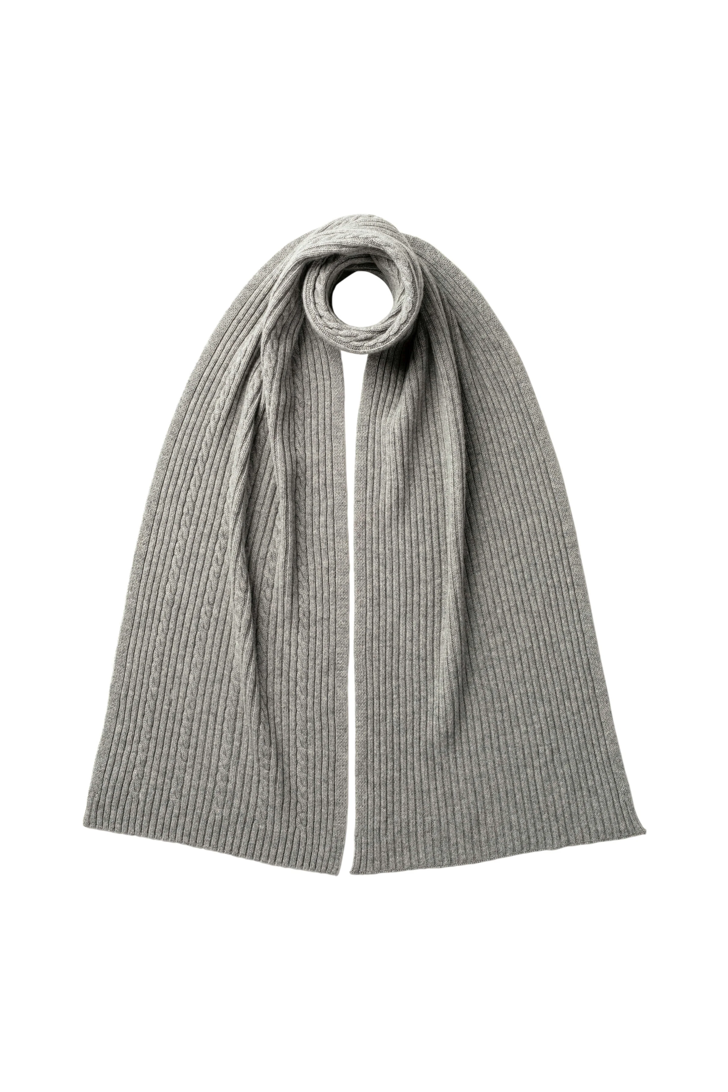 A classic cable pattern gives way to ribbed detailing at the ends of this cosy grey scarf. Made with the softest cashmere fibres. Knitted in our own mill in Hawick in the Scottish Borders. Pair with our Cable and Rib Beanie . PRODUCT DETAILS 100% Cashmere 180x30cm | 71x12" 2 Ply: Two individual strands are twisted to create this yarn, producing a durable, lightweight knit. Made in Scotland Code: HAA03402