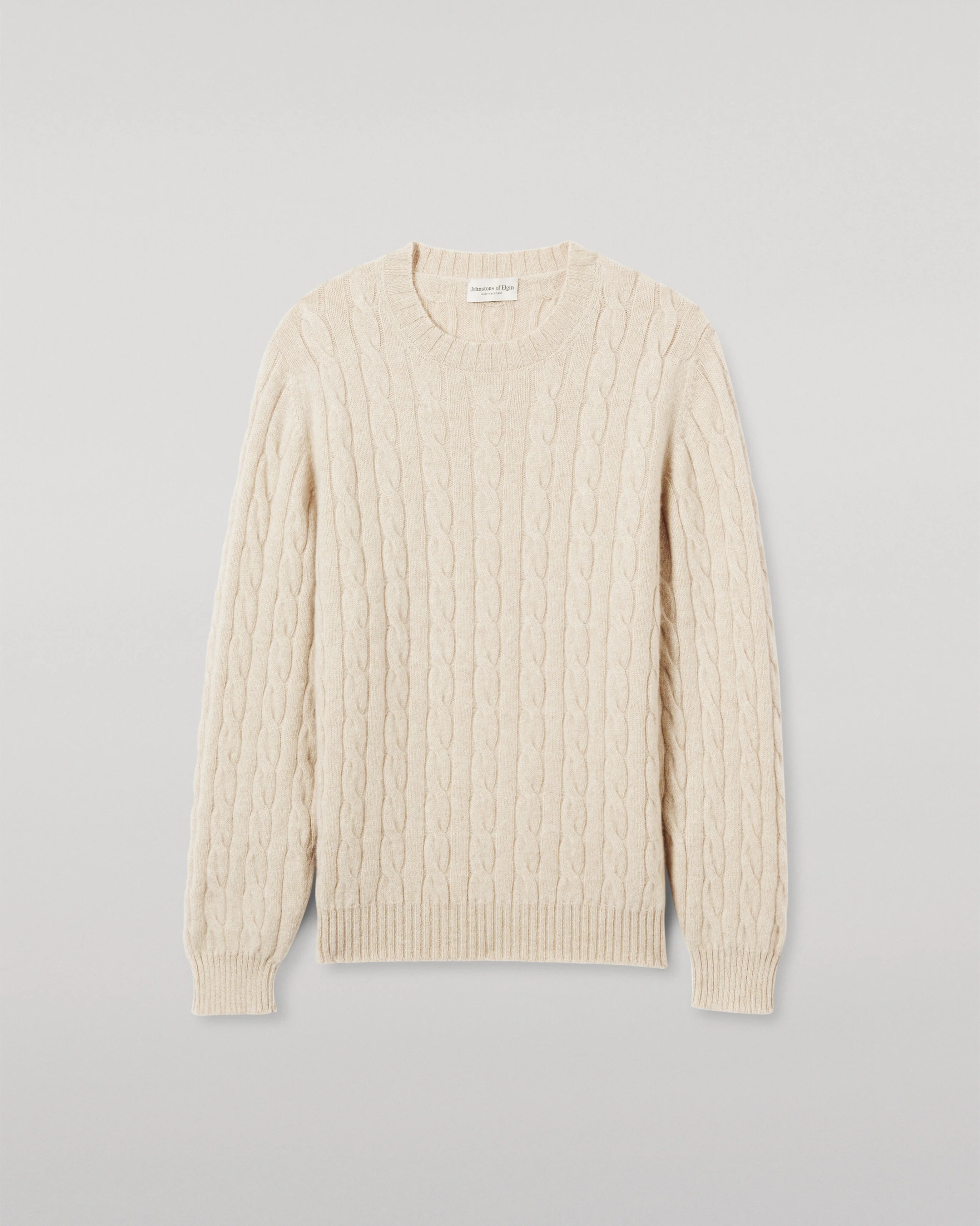 The Calder is a classic cable-knit jumper with a ribbed crew neck, hem and cuffs, knitted in our Hawick Mill from 2-ply yarns of our super-soft aeriated 100% cashmere. This timeless and elevated silhouette comes in a natural White Sand shade, which can be worn casually or paired with more refined tailoring. PRODUCT DETAILS • Regular Fit • 100% Cashmere • White Sand • Cable Knit Design • Ribbed Crew Neck • Ribbed Cuffs & Hem • 2-Ply Construction • Made In Scotland • Model is 6ft1 / 187cm and wears a M • KAC05751