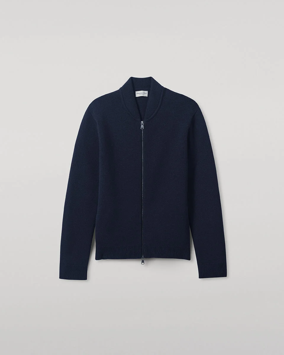 Elevate your outerwear game with our Navy Cashmere Milano Stitch Baseball Zip Jacket. Crafted from luxurious, heavier weight cashmere, this jacket boasts a refined Milano stitch for a sleek, tailored silhouette. Featuring a contemporary baseball collar and a double-ended gunmetal zipper for a modern edge, it’s both stylish and functional. With side pockets for added practicality, this jacket effortlessly combines elegance and comfort, making it a versatile addition to your wardrobe. PRODUCT DETAILS 100% Cashmere 2 Ply: Two individual strands are twisted to create this yarn, producing a durable, lightweight knit. Model is 6ft2 and wear a size M Made in Scotland Code: KAA05443