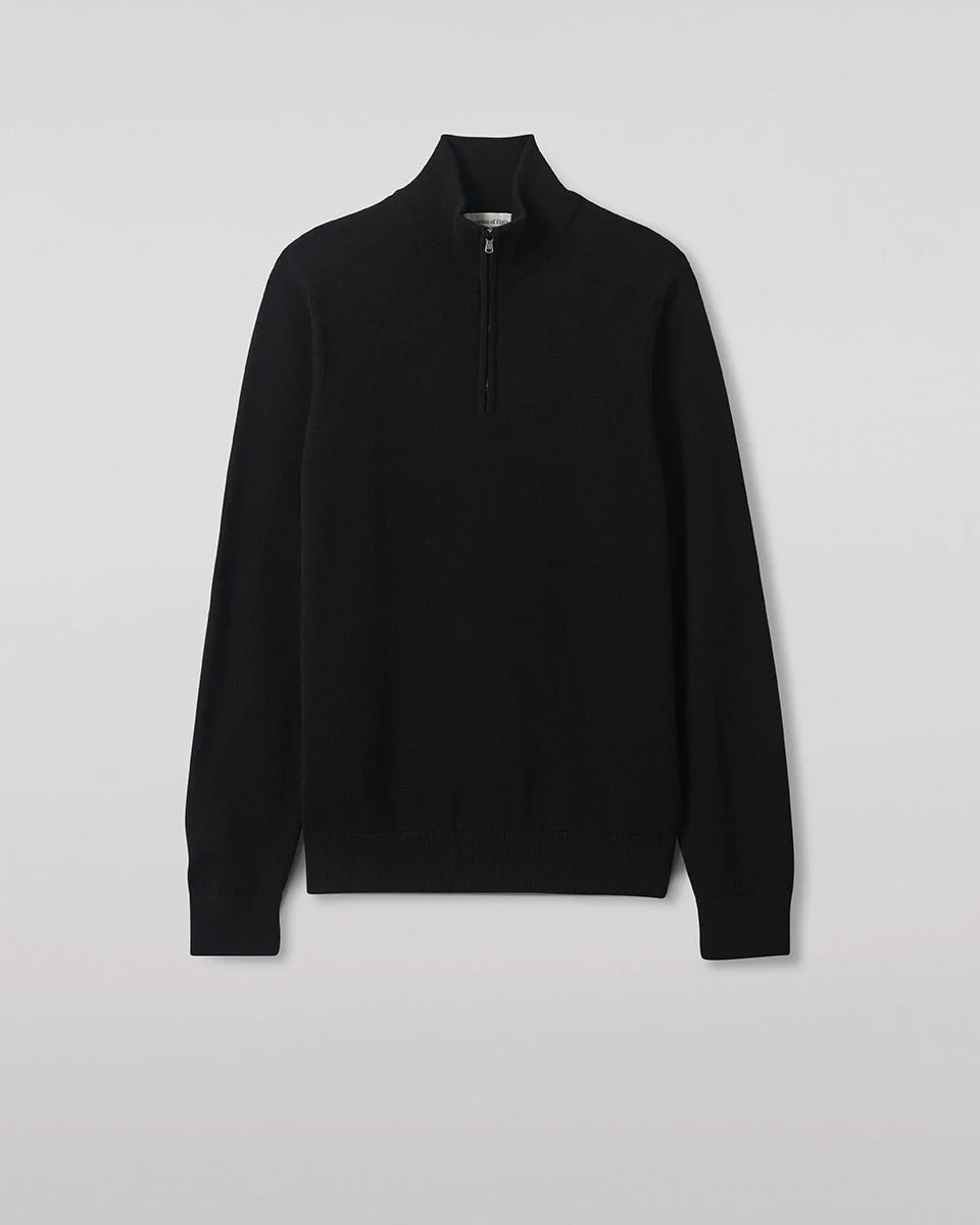 The Black Classic Cashmere Zip Neck Jumper is a lightweight, comfortable sweater made from fine Scottish cashmere. Its simple design and gunmetal zip make it easy to wear for both casual and smart occasions. PRODUCT DETAILS 100% Cashmere 2 Ply: Two individual strands are twisted to create this yarn, producing a durable, lightweight knit. Model is 6ft2 and wear a size M Made in Scotland Code: KAP05695